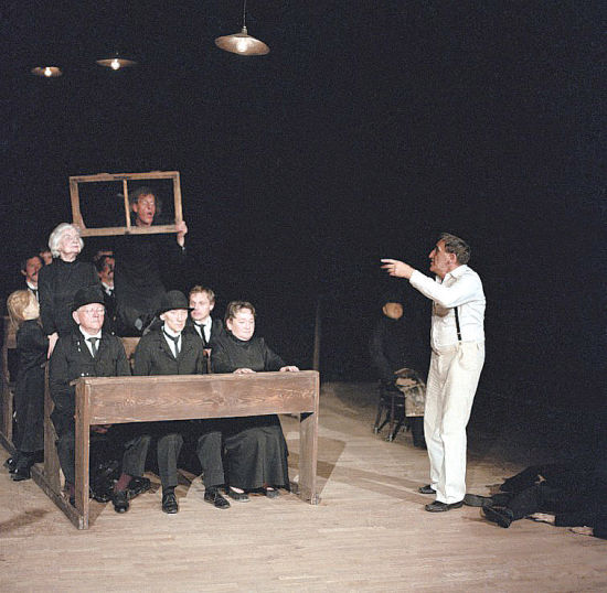 康多爾作為演出的“觀看者”出現(xiàn)在舞臺上,也是其獨到之處。他想通過“觀看”的一系列反應(yīng)去引導(dǎo)觀眾與演員的交流,然而,他的在場,恰恰成為舞 臺上的“死亡物”與觀眾之間的另一層介質(zhì),他轉(zhuǎn)譯了歷史與過去之于今天的意義。康多爾出生的時代,是一個政體動蕩、戰(zhàn)火漫天的時代,他血脈里的猶太民族精 神注定了他在這個時代的悲苦和絕不屈從。他的父親是一名波蘭軍官,長期征戰(zhàn)在外,沒有參與他的成長,后在二戰(zhàn)中慘死于奧斯維辛集中營。父親的缺席與民族的 被迫害使康多爾對死亡寄寓著追思與希望,他一生反抗主流、逆其道而行,反而成就了獨特的戲劇美學(xué)觀,終其一生探索戲劇的本質(zhì)。