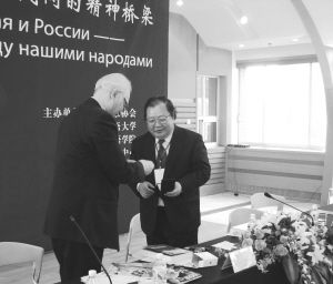 吉狄馬加(右)獲得由俄羅斯作家協(xié)會頒發(fā)的肖洛霍夫文學紀念獎章。