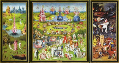 博斯最負(fù)盛名、也最竭盡心力的 《人間樂園》,被認(rèn)為是其最“燒腦”的作品,畫作涵義的復(fù)雜性以及生動(dòng)的意象令人嘆為觀止。這是一幅寬近4米的三聯(lián)畫,從表面上看從左至右的三幅畫分別描繪的是天堂中亞當(dāng)和夏娃被創(chuàng)造、世間人類的情欲和享樂、地獄中噩夢(mèng)般的景象。畫面中的男男女女、奇花異草與飛禽走獸交互混雜,數(shù)量多達(dá)數(shù)百,并且很多都有著隱秘的出處。比如,畫面中有一對(duì)戀人置身于巨大的透明氣泡中,這個(gè)氣泡好像馬上就會(huì)破碎,這正印證了當(dāng)?shù)匾痪涔爬系母裱裕骸靶腋>腿鐨馀荩芸炀蜁?huì)破滅”。中間一聯(lián)畫面中央一個(gè)像地球儀一樣的巨大圓球,出自歐洲中世紀(jì)的傳說(shuō)“青春不老泉”。左邊一聯(lián)中,置于水池中央的哥特式噴泉頗似蒸餾器,似乎預(yù)示著歷經(jīng)地獄的蒸餾,人類將得到精神的升華。博斯的靈感顯然也包括家鄉(xiāng)的狂歡節(jié)傳統(tǒng),每到狂歡節(jié),人們就會(huì)穿上奇裝異服到大街上游行歡騰,全然不顧規(guī)矩、禁忌。