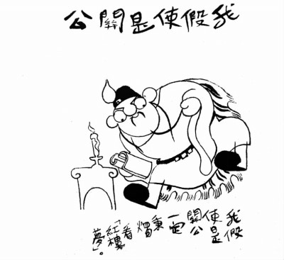 高龍生 (1903-1977) 的 《阿斗畫傳》 主要發(fā)表在《十日雜志》 上?!鞍⒍贰笔菍⑷龂鴷r代扶不起的阿斗和魯迅的阿Q結(jié)合起來的形象,他頭頂瓜皮帽,身穿破衣衫,樸實的方臉上布滿深刻的皺紋,看上去飽經(jīng)風霜又老實可欺。這個阿斗逆來順受,毫不掩飾自己的愚頑,大膽展露自己的弱點,而使人警醒,很有現(xiàn)代感。其中 《一個怪夢》最為驚悚:阿斗被蛇盤住,掙扎中被蛇吞入左臂,他干脆一斧子砍掉自己的胳臂,順勢砍下蛇頭……