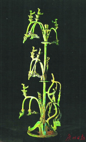 青銅神樹,夏代晚期青銅器,1986年出土于四川廣漢三星堆遺址,收藏于四川三星堆博物館。青銅神樹共有八棵,其中一號大神樹高達3.96米,樹干殘高3.84米。最上端部分已經(jīng)缺失,否則神樹的全部高度應(yīng)該在4米以上。這棵神樹造型詭異,有三層枝葉,每層有三根樹枝,樹枝的花果或上翹或下垂。三根上翹樹枝的花果上都站立著一只鳥,鳥共九只。神樹的下部懸著一條龍,龍的頭朝下、尾在上,夭矯多姿。整棵樹給人的感覺是有通天的氣勢,所以又被叫做通天神樹。