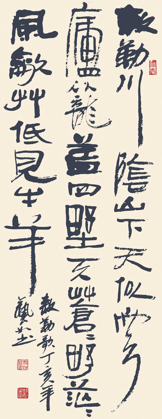 漢簡牘片在20世紀(jì)才大量出土,雖多是下層文吏記述公務(wù)之筆,但其中不乏渾然天成的精品。同時,它也是中國書法由篆書開始孕育幾種字體的一個重要的開端,它所包含的豐富性,足以成為中國書法藝術(shù)的原型。藝如樂圖不僅在蒙古文書法方面受到漢簡的影響,而且在漢語書法中也繼承和發(fā)揚了漢簡的筆法和技巧。他始終自覺傳承、探索和實踐漢簡書法藝術(shù),作為一個當(dāng)代書法家,他師古卻不泥古,在借鑒古人的同時勇于創(chuàng)新,開辟出自己的一片天地。我非常喜歡他的《敕勒歌》,筆法、形式甚至?xí)鴮憼顟B(tài),既保持了漢代簡書的自然、飛動和雄健的美感,也發(fā)揮了自己隨意、瀟灑的個性。他的漢簡隸書“杜甫詩《春夜喜雨》”,筆墨的粗細(xì)、濃枯,錯落有秩,樸拙而自然。而他的“節(jié)錄唐詩”,更是將漢簡書法藝術(shù)展現(xiàn)得淋漓盡致,唐詩、漢簡墨跡、不規(guī)則的牘片、朱砂印章等組合成一個詩與書的簡牘陣, 讓人嘆為觀止。
