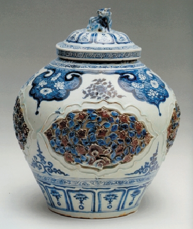 元青花 釉里紅開光鏤空花卉紋蓋罐 高41.2厘米 河北文物保護(hù)中心藏