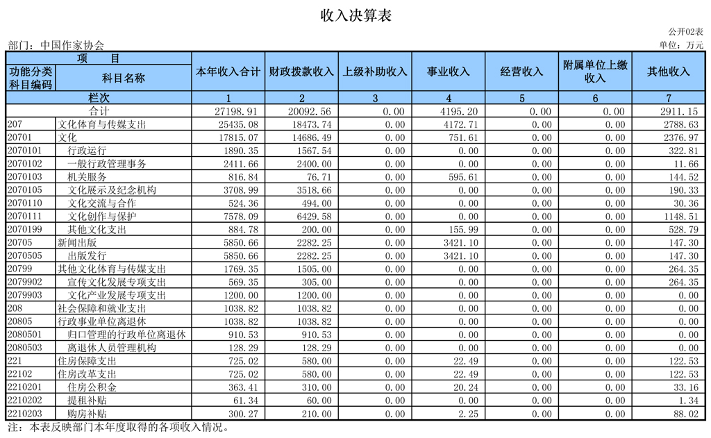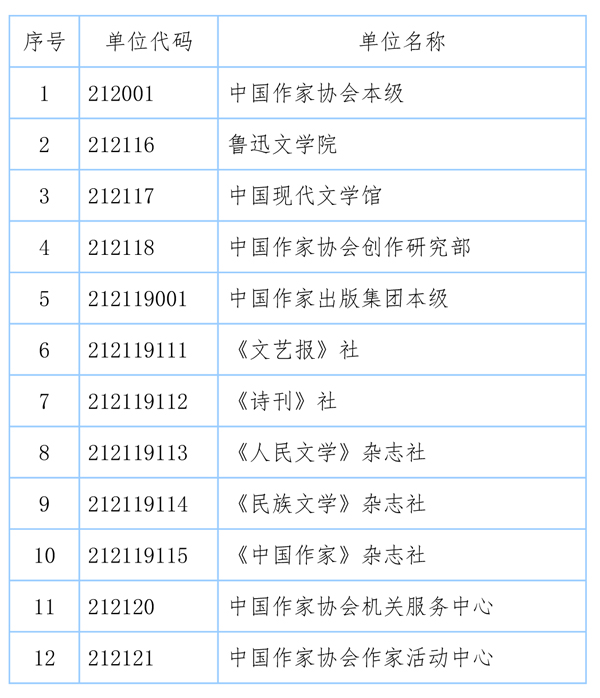 中國作家協(xié)會(簡稱中國作協(xié))2015年部門決算包括中國作協(xié)本級決算及所屬11個事業(yè)單位決算,同比不變。納入2015年部門決算編制范圍的單位詳見下表: