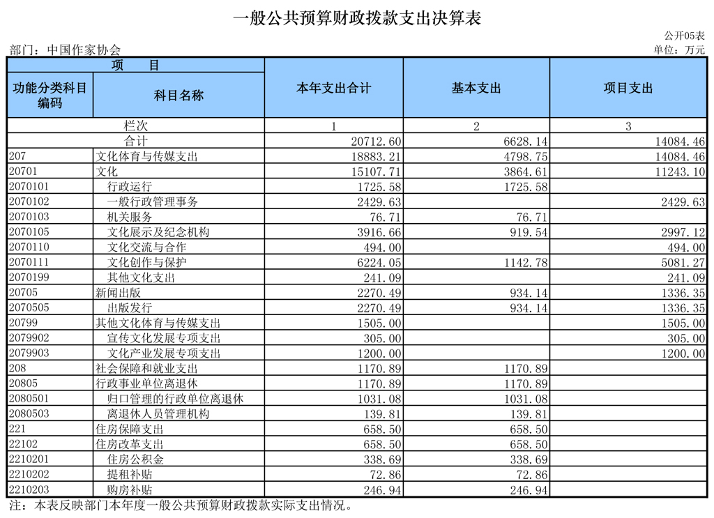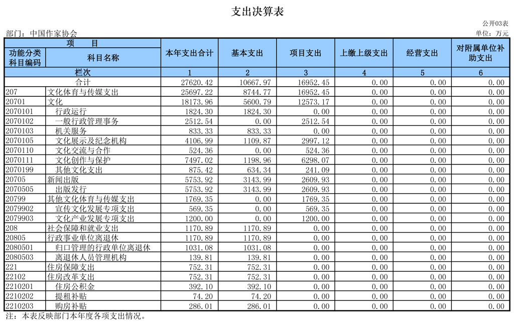 八、文化體育與傳媒(類)文化(款)一般行政管理事務(wù)(項(xiàng)):指中國作協(xié)本級組織作家深入生活等各項(xiàng)支出。