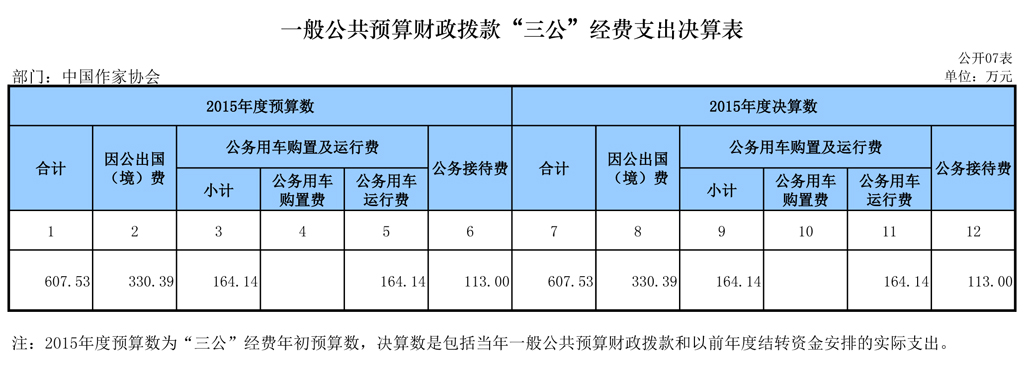 中國作家協(xié)會2015年財(cái)政撥款“三公”經(jīng)費(fèi)支出預(yù)算為607.53萬元,其中:因公出國(境)費(fèi)330.39萬元,公務(wù)用車運(yùn)行費(fèi)164.14萬元,公務(wù)接待費(fèi)113萬元。