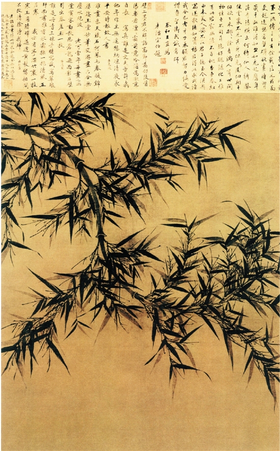 歷代寫竹大家都把自己的創(chuàng)作思想寫成文字,或詩或文留給后世留下豐富的文獻(xiàn)。如文同的“胸有成竹”,鄭板橋的“胸?zé)o成竹”,兩種不同的創(chuàng)作美學(xué)觀,啟迪了歷史上多少畫家的思維及思索,亦成就了無數(shù)的畫竹神品、妙品。再有倪瓚在《疏竹圖》的題跋上寫道:“余之竹,聊以寫胸中逸氣耳。豈復(fù)較其似與非,葉之繁與疏,枝之與直哉。或涂抹久之,它人視以為麻為蘆,仆亦不能強(qiáng)辯為竹,真沒奈覽者何?!边@一段話影響了500百年來中國畫竹藝術(shù)的創(chuàng)作和審美的法則。