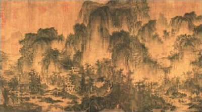 李成乃唐宗室后裔,祖籍長安(今西安),后周時避居于營丘(今山東臨淄),故其又被稱為“李營丘”。李成長期居于北方,此圖描繪的正是北方夏日山水之景,近處輕舟泊渡,行人車馬往來,山谷之間殿閣林立,塔影隱沒其中。遠處奇峰崛立,氣象雄渾。北方山石質(zhì)地堅硬,裸露少土,多棱角凹凸,此畫中作者以形似斧劈和卷云的皴法,呈現(xiàn)出了北方典型的地貌特征。