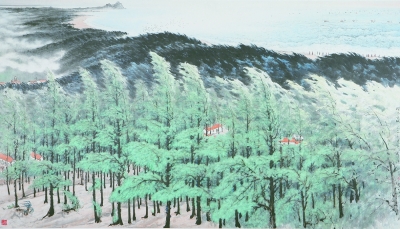 關(guān)山月的家鄉(xiāng)在粵西海濱,屬風沙帶,很難生長植物,小時候常受臺風侵害。新中國成立后,黨和政府提倡植樹造林,漁民們男的下海,女的植樹,在南粵海濱種起了木麻黃林帶,海疆也發(fā)生了變化,風沙地植滿木麻黃樹,這景色深深地打動了關(guān)山月,然而景色雖然好看,但并不好畫,古人更沒有畫過。怎樣表現(xiàn)木麻黃樹的性格和特征?怎樣表現(xiàn)海濤和林濤融在一起的感覺?1973年,關(guān)山月先是到粵西電白縣虎頭山腳下的民兵哨所住下,和民兵們一道生活,他早晚登上虎頭山頂峰的綠海亭看林帶和海水的變化,感受林濤和海濤聲音合奏的氣勢,在深入生活中體驗林帶之美,后來他還到博賀漁港參觀了“三八”林帶和菠蘿山林帶寫生,獲取了許多珍貴的一手素材。在畫面的構(gòu)圖上,他注重氣勢的連貫,采取“之”字形迂回走向的構(gòu)圖方式來表現(xiàn)悠長的林帶,既避免了林帶的單調(diào),又很好地表現(xiàn)出海岸景觀的寬闊浩渺。在具體畫面的處理上,他根據(jù)自己的感受和畫面意境的需要,大量采用石綠色,并吸收西洋畫法,用層層加染的方法來表現(xiàn)樹林深沉厚重的感覺,為了強化林帶的深邃和內(nèi)聚的視覺趣味,第一層用顏色,第二層用水墨,力求把林帶的層次表現(xiàn)出來,海水的畫法也同樣吸收西洋的畫法,使它在風格上與林帶統(tǒng)一。這種大膽地將西洋繪畫和中國傳統(tǒng)大青綠的手法相結(jié)合的畫法,大面積地運用石綠,層層加蓋,鋪排渲染,強調(diào)色彩的力度,使畫面淡而不薄、厚而不滯,在統(tǒng)一中求變化,于豐富中現(xiàn)統(tǒng)一,以求達到色不礙墨、墨不礙色的藝術(shù)效果。從整個畫面來看,畫面遠處的海面上煙波浩渺、機帆點點,近處的木麻黃樹迎風而立、搖曳多姿,遠樹如層波疊浪構(gòu)成一道綠色的屏障,叢林中還隱現(xiàn)著一隊巡邏的民兵,表現(xiàn)出具有中國畫南方海岸風情和時代色彩的“綠色長城”,也暗喻了那個時代沿海人民眾志成城改造自然和保衛(wèi)祖國海疆的精神和力量。
