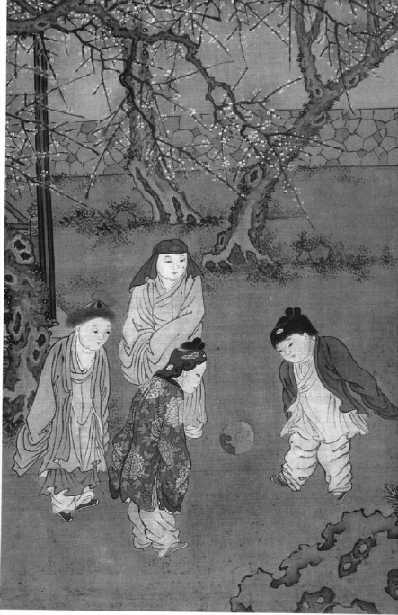 除宮廷喜好外,“蹴鞠”運(yùn)動(dòng)在民間亦十分流行。詩(shī)人陸游即在《晚春感事》中有名句:“少年騎馬入咸陽(yáng),鶻似身輕蝶似狂;蹴鞠場(chǎng)邊萬人看,秋千旗下一春忙?!倍_(tái)北故宮博物院所藏宋代蘇漢臣繪《長(zhǎng)春百子圖卷》中,筆法工整,人物衣著細(xì)膩,景色分明,百童嬉戲情景躍然紙上。畫中即有四個(gè)孩子蹴鞠的場(chǎng)景:右邊的童子忙著顛球,另外三個(gè)人則全神貫注地注視著他,中間的蹴鞠由赤、青、藍(lán)、赭等不同顏色的皮革制成。