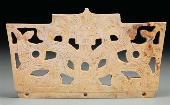 1986年浙江省杭州市余杭區(qū)瓶窯鎮(zhèn)反山遺址M15出土 玉冠狀器為良渚文化時(shí)期帶有禮儀性質(zhì)的裝飾玉器。該器物平面整體呈寶蓋頭結(jié)構(gòu),如同良渚文化晚期的臺(tái)階形玉片的結(jié)構(gòu),冠頂中部切割呈寶蓋頭結(jié)構(gòu),下端扁榫上有三個(gè)等距的對(duì)鉆小孔。正反兩面以透雕和陰線刻劃相結(jié)合的技法,對(duì)稱雕琢肢體俱全的神人圖像,填刻光芒線的寶蓋頭冠帽,倒梯形臉部,單圈眼,一側(cè)刻劃眼角,刻劃有牙齒的寬嘴。神人上臂兩側(cè)各“持”有鳥(niǎo)形象,此部位紋飾或可視為獸面紋的雙眼,神人胸腹部位為一般常見(jiàn)的圓拱形結(jié)構(gòu)。兩面的紋飾除個(gè)別刻劃線條的結(jié)構(gòu)有區(qū)別外,余均一致。