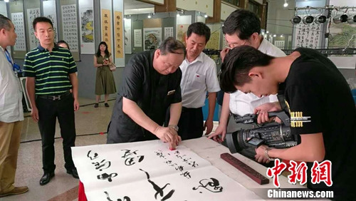 5日,“第七屆全國(guó)建材行業(yè)書(shū)畫(huà)展現(xiàn)場(chǎng)筆會(huì)”在北京舉行。會(huì)上,著名書(shū)法家崔承順、畫(huà)家王闊海等在現(xiàn)場(chǎng)進(jìn)行創(chuàng)作。著名相聲表演藝術(shù)家姜昆亦出席了本次活動(dòng)。參加本次筆會(huì)的知名畫(huà)家何寶立在接受中新網(wǎng)(微信公眾號(hào):cns2012)記者采訪時(shí)表示,本次筆會(huì)在畫(huà)展中舉行的,形式新穎,“受到不少觀眾的歡迎”。
