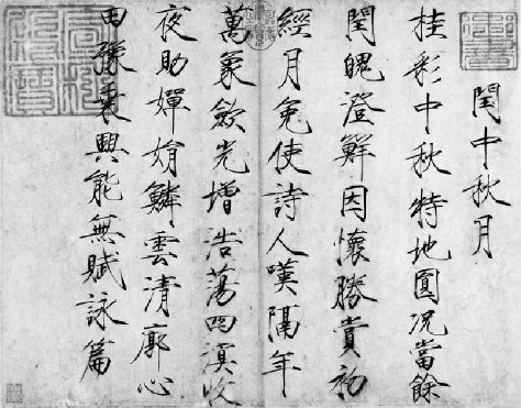 《閏中秋月帖》中所記為一首七言律詩:“桂彩中秋特地圓,況當(dāng)余閏魄澄鮮。因懷勝賞初經(jīng)月,免使詩人嘆隔年。萬象斂光增浩蕩,四溟收夜助嬋娟。鱗云清廓心田豫,乘興能無賦詠篇?!?/p>