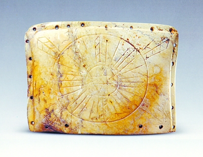 長江中下游和黃河下游的史前遺址中常見八角形符號,很多學(xué)者認(rèn)為這種符號包含了“天圜地方”的含義。尤其是安徽含山凌家灘遺址出土的玉版(上圖)。玉版呈長方形,剖面略成拱形,內(nèi)外兩面精磨,其中三條邊磨出榫緣,且兩條短邊各鉆有5個圓孔,長邊9個,沒有榫緣的鉆有4個圓孔。玉版正面雕刻兩個同心圓,圓中心琢制有一個八角圖案,兩圓之間以直線平均分為8個區(qū)域,每區(qū)內(nèi)各雕琢一枚矢狀葉脈紋;外圓與邊框之間又雕琢4枚矢狀葉脈紋,指向玉版四角。