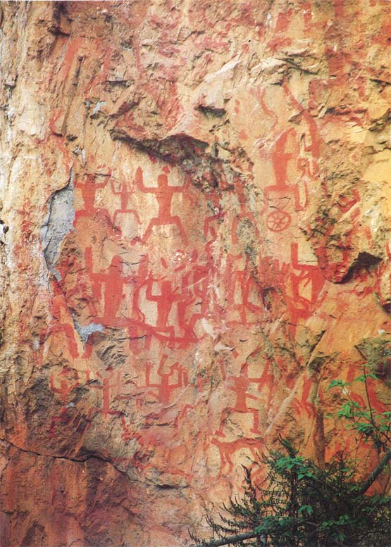 應(yīng)該指出的是把我國古代巖畫分為南繪北刻的兩大體系,只是從全局出發(fā)而進行的整體性概括。千差萬別的中國古代巖畫,自然會有許多特殊而變異的類型。例如,東南沿海的江蘇連云港將軍崖巖畫就是敲刻而成,不可能劃歸南方高地涂繪型巖畫的行列。內(nèi)蒙古元代巖畫中就有許多是佛教喇嘛用石灰調(diào)和素油后涂繪而成,明顯也不可能納入北方草原敲刻型巖畫之內(nèi)。正是基于中國古代巖畫所具備的分布的廣泛性、內(nèi)容的豐富性和技法的多樣性,使其在世界巖畫的寶庫內(nèi)占有了獨特而重要的藝術(shù)地位。