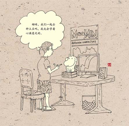 回國(guó)后,我查閱了一些資料,對(duì)MOONMIN有了更多的了解。托芙·楊松女士于1945年在瑞典出版了首部以MOONMIN為主角的圖書,書名叫《姆咪遇到大洪水》。此書出版后,很受讀者喜愛,于是托芙·楊松就一發(fā)不可收拾地寫啊寫,畫啊畫。到今天,以姆咪一家為主角的圖書已經(jīng)成為讓全世界孩子著迷的經(jīng)典讀物了,而姆咪這個(gè)形象更是深入人心。我敢保證,只要看上一眼,就會(huì)一輩子記住這個(gè)可愛至極的小胖子。相對(duì)于托芙·楊松的文字,我更喜歡她所創(chuàng)作的姆咪形象。無可質(zhì)疑,楊松的故事和文字是世界級(jí)的,而她的繪畫和創(chuàng)造力則更勝一籌。放眼世界,可以找出很多非常優(yōu)秀的兒童文學(xué)作家或畫家,但能像托芙·楊松這般把文學(xué)與繪畫都玩得如此精妙的,可以說目前是無出其右。有人曾問我,姆咪的形象到底好在哪兒?我的回答是:簡(jiǎn)約和天真。