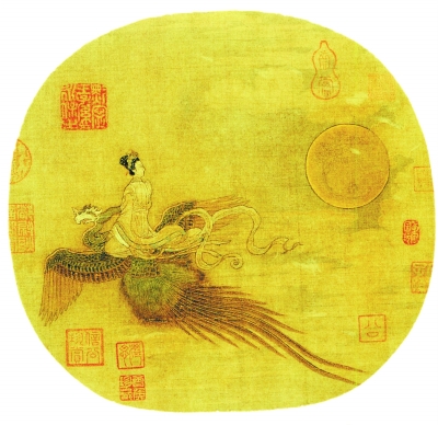 五代時(shí)期周文矩所繪《仙女乘鸞圖》里的中秋大月亮(現(xiàn)藏于故宮博物院)