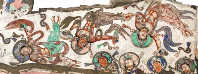 龜茲壁畫中的樂器既有本土固有樂器,如五弦琵琶、羯鼓等;也有來自中原的樂器,如排簫和鼗鼓;還有來自西亞、印度的樂器,如豎箜篌和貝,既體現(xiàn)著多種文化在龜茲地區(qū)的交匯,也體現(xiàn)了其獨(dú)特的樂器體系。不同的樂器常常編排在一起,形成樂隊(duì),編排方式上以吹樂、彈樂和鼓樂并用為特色,其中吹奏樂器能演奏旋律及和聲,彈撥樂器能彈奏旋律和節(jié)奏,打擊樂器則能擊打節(jié)奏。這些樂器,既可以合奏,也可以獨(dú)奏。