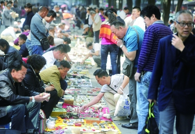 10月10日,收藏愛(ài)好者在地?cái)偽幕?jié)上“淘寶”。當(dāng)天,由省文化廳、省文物局和湖南日?qǐng)?bào)等單位主辦的第16屆湖南文物(國(guó)際)博覽會(huì)在長(zhǎng)沙舉行。本屆博覽會(huì)將開展文物交流會(huì)、文物“床交會(huì)”、首屆儺文化展演藝術(shù)周和大麓古玩城地?cái)偽幕?jié)等活動(dòng)。