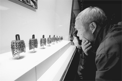 11日,觀眾在江西省博物館欣賞西漢成套編鐘。