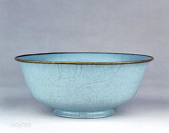 整個(gè)碗高7.1厘米,碗口直徑16.9厘米,圈足直徑7.5厘米,重350克。撇口,外鑲銅邊。深弧腹,圈足微外撇。胎體輕薄。通體滿釉,有細(xì)小開(kāi)片。外底有5個(gè)細(xì)小芝麻狀支釘痕,內(nèi)底刻有楷書(shū)乾隆御題詩(shī):“均窯都出脩內(nèi)司,至今盤多碗艱致。內(nèi)府藏盤數(shù)近百,碗則晨星見(jiàn)一二。何物不可窮其理,碗大難藏盤小易,于斯亦當(dāng)知懼哉,愈大愈難守其器?!焙笫稹扒”缬}”,并鈐“比德”“朗潤(rùn)”二印。目前所見(jiàn)傳世宋代汝窯碗僅有兩件,除這件外,北京故宮博物院亦收藏一件。