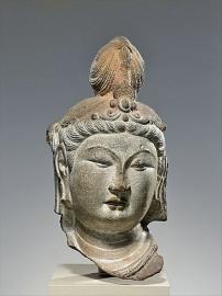 天龍山第21窟的菩薩頭,是典型的天龍山唐代造像的樣式;高寶髻,頭上飾摩尼珠,面相渾圓豐滿,頭部微傾,眉線細(xì)長(zhǎng),兩眼下視,菩薩雙目含笑,嘴唇微啟,神情安詳,顯得非常敦厚和藹。秀挺的鼻梁,與大、圓、滿的臉盤形成對(duì)照。菩薩頭束著唐代婦女常見(jiàn)的高發(fā)髻,頸部刻出三道蠶紋線,櫻桃小嘴及圓嘟嘟的臉龐,是盛唐以胖為美的經(jīng)典造型。整尊頭像精美細(xì)膩,膚色光潔柔美,神態(tài)安詳逼真,是中國(guó)石雕造像中的極品之作。