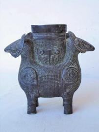 雙羊尊筒形口,腹為雙羊前軀相背狀。羊角大彎曲,尊口下飾弦紋和龍面饕餮紋,較為罕見(jiàn)。羊頜下及腹下飾扉棱,象征須和腹部垂毛。飾龍面紋,腹飾鱗紋,腿飾龍紋。1860年“火燒圓明園”后被掠奪并流失海外。