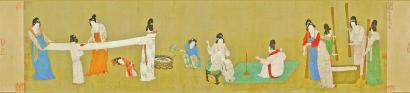 《搗練圖》是中國(guó)唐代名畫(huà),是一幅工筆重設(shè)色畫(huà),表現(xiàn)貴族婦女搗練縫衣的工作場(chǎng)面。系盛唐時(shí)的一幅重要的風(fēng)俗畫(huà),對(duì)后世繪畫(huà)風(fēng)格有重大影響,是唐代仕女畫(huà)中取材較為別致的作品,系唐代畫(huà)家張萱之作。畫(huà)作原屬圓明園收藏,1860年“火燒圓明園”后被掠奪并流失海外。