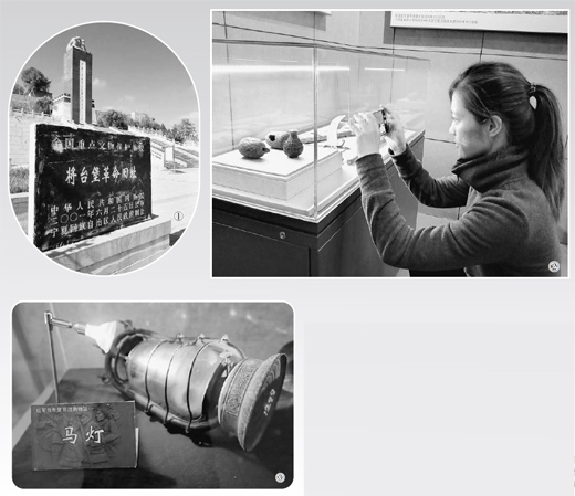 圖①:將臺堡革命舊址。 孫 湄攝 圖②:觀眾在紅軍會寧會師紀念館興致勃勃地參觀。 本報記者 鄭海鷗攝 圖③:寧夏西吉將臺堡紅軍長征會師紀念園內收藏的紅軍曾使用過的馬燈。 成 浩攝