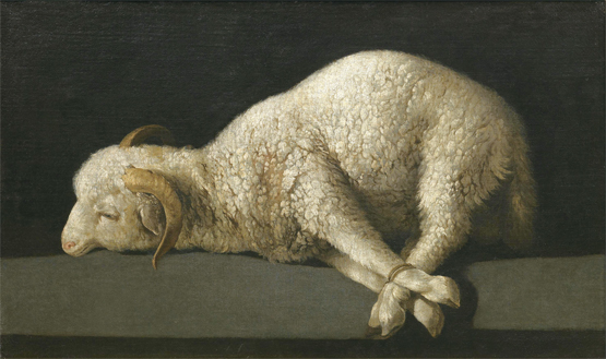西班牙繪畫“黃金世紀(jì)”的杰出畫家蘇爾瓦朗(Francisco de Zurbarán, 1598-1664)實(shí)際上創(chuàng)作了一系列以天主羔羊?yàn)轭}的畫作,目前已知的有六幅,我們現(xiàn)在看到的就是其中一幅,被普遍認(rèn)為是藝術(shù)水準(zhǔn)最高的,現(xiàn)藏馬德里普拉多博物館。與他的同輩好友、宮廷畫師委拉斯開茲相比,蘇爾瓦朗沒有那么好的運(yùn)氣,“京漂”的生活并不成功,家庭生活也多災(zāi)多難,一生大部分時間在外省作畫,收入微薄,主顧多為教會,因而創(chuàng)作了大量的宗教題材的作品。他畫得最多的是圣徒、基督、教會人士,而他筆下的靜物,不論是待宰的羔羊,還是水果或是瓶瓶罐罐,也往往和他的宗教人物畫具有同樣的風(fēng)格語言——曖昧不明的平面,幽深的背景,所表現(xiàn)的對象獲得了極為逼真的三維再現(xiàn),被不知發(fā)自何處的一道圣光打亮,仿佛無生命的事物或不會言語的動物也成了神性氛圍中的圣徒。要不是19世紀(jì)的后人對他的作品的再發(fā)現(xiàn),蘇爾瓦朗恐怕就要和他的靜物一樣永遠(yuǎn)湮沒在無垠的黑暗中了。