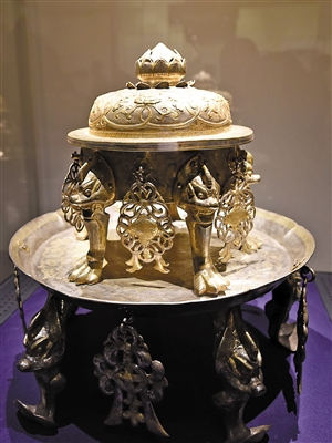 “1987年扶風(fēng)法門寺地宮后室出土的唐代鎏金四天王盝頂銀寶函、鎏金如意輪觀音盝頂純金寶函、嵌寶石水晶槨子、鎏金臥龜蓮花紋五足朵帶銀熏爐及銀爐臺、越窯秘色瓷八棱凈瓶等將悉數(shù)現(xiàn)身展廳?!比~楊說。