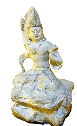 安國寺是唐代著名的皇家寺院,位于唐長安城長樂坊, 北面即大明宮,東面原為禁苑,開元后改為王宅。唐景云元年(710),睿宗將舊藩宅邸舍立為安國寺。開元初年唐玄宗以寢殿之材建安國寺彌勒殿, 憲宗時又有所修葺, 寺殿雄闊,名僧云集,吳道子等名家壁畫眾多,其中紅樓院、楞伽院等名噪一時。武宗滅佛時被毀, 唐懿宗咸通七年(866)重建。安國寺也是中晚唐重要的密教道場之一。1959年,西安城東北角安國寺舊址窖穴中發(fā)現(xiàn)十一尊華麗貼金畫彩的密宗石刻造佛像,造型獨特,雕飾華麗,工藝精湛,包括寶生佛、文殊菩薩、菩薩頭像、降三世明王、馬頭明王、不動明王、金剛手以及殘明王像等,明王忿怒狂怪、多頭多臂等形象迥異于慈眉善目的傳統(tǒng)佛教造像,或是唐武宗會昌五年(845)毀佛時被埋藏。該批造像或?qū)僦刑泼芙膛d盛時期即代宗、德宗時期作品,當(dāng)是安國寺佛教堂院內(nèi)立體曼荼羅諸尊像。
