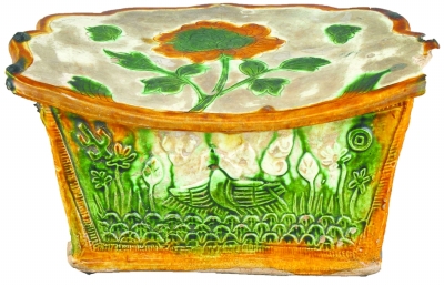 河北省豐寧滿族自治縣是多民族地區(qū),曾先后有肅慎、山戎、匈奴、庫莫奚、契丹、女真、蒙古、滿洲等民族聚居,他們在這里創(chuàng)造了燦爛的民族文化,同時也給后世子孫留下了大量的珍貴文物。豐寧博物館收藏著一件遼代的“三彩瓷枕”(左圖)。這件“鎮(zhèn)館之寶”學(xué)名是“三彩云頭形雙碟牡丹紋貼花獅面五角長方形枕”,是遼代的生活用品,目前在全國是唯一一件。右圖為“和尚坐罐”,又叫“蟹青釉開光龍鳳仙人壽字松鶴紋帶蓋葫蘆頂大甕”,為元代和尚的喪葬用品,全國也只發(fā)現(xiàn)兩件。
