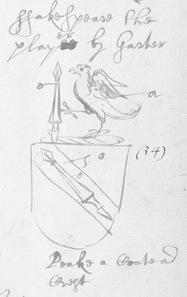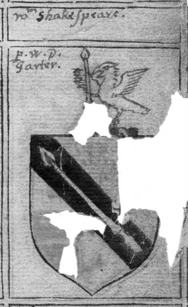 莎士比亞家族的盾徽大概是什么樣子,我們早已知道,因為莎士比亞墓碑的上方就有(圖2)。另外,早在1908年之前就已經(jīng)有7幅莎士比亞盾徽草圖被3家機構(gòu)收藏,位于倫敦的英國盾徽院藏有4幅,牛津大學(xué)圖書館藏有1幅,美國的福爾杰圖書館藏有2幅。這些盾徽草圖與之莎士比亞墓碑上的盾徽大同小異。盾冠是一只展開雙翅的隼。莎士比亞生前最喜歡這種猛禽,其著作中隼字出現(xiàn)的次數(shù)高于任何其他鳥名。隼的一只爪抓著一根矛(spear)的柄,用來會意構(gòu)成Shakespeare這一姓氏的shake和spear(“搖動”“矛”)。盾徽本身的圖案是,以一條黑帶為背景,黑帶上一只矛斜貫整個盾徽,矛尖與筆尖相似,矛柄與筆桿相似。這恐怕不是偶然巧合,而是暗示威廉·莎士比亞的作家身份。福爾杰圖書館收藏的草圖中,有一幅的圖案下方標(biāo)注著“戲子莎士比亞,襪帶騎士繪”的字樣(如圖3)。照理說,既然沒有任何證據(jù)表明倫敦當(dāng)時有兩個同叫莎士比亞的戲子,或一個戲子,一個作家,盾徽草圖和墓碑上的盾徽便構(gòu)成一個證據(jù)鏈,證明倫敦的戲子莎士比亞和葬于斯特拉特福鎮(zhèn)的莎士比亞是同一個人。然而倒莎派提出,這兩個盾徽都是莎士比亞去世之后雕刻或繪制的,不足為憑。