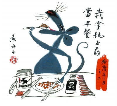 黃先生生肖畫的最大特色就是其“黃氏幽默”,他用他的具有漫畫特點(diǎn)的形象構(gòu)成,他用他的題語,以文與圖相得益彰的配合,往往令人拍案叫絕——他畫“嫁狗隨狗”,一個打著領(lǐng)帶蹲著的狗,左側(cè)站立一盛裝但不露臉的新娘;畫一鄉(xiāng)間常見的趕著種豬的人,“豬賣愛情人收錢”;畫一肥豬,“人自己減肥卻怕我瘦”;畫一只貓推著坐著老鼠的車,“也不想一想,牠為什么對你這么好”;而畫“老鼠吹牛系列”,之一“我把老鼠夾子當(dāng)健身器”;之二“我拿耗子藥當(dāng)早餐”;之三是老鼠指著挺著大肚子懷孕的貓,說“牠肚子是我搞大的”。如此等等,他的這樣一種諷刺而幽默的方式,不管是用于政治的、社會的、還是生活的,都形象地表達(dá)出了對一個問題的看法。其中有些是直面現(xiàn)實(shí)的,如畫身陷囹圄的父子,“虎父無犬子”;畫月亮前的搗藥的兔子,“月亮上造假藥最保險(xiǎn)”;畫被馬的后蹄踢倒的伯樂,“伯樂早晚也會挨一腳”;畫一背雙肩背書包、壓彎了腰的男童,諷刺當(dāng)下小學(xué)生學(xué)業(yè)太重的問題;在“花果山水簾洞二萬次代表大會”的橫幅下,老猴王正在大叫“開會了!不要玩手機(jī)”,而其前面塞滿畫面的15只猴,個個在玩手機(jī)。