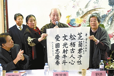 昨日現場播放了一段用10天時間拍攝剪輯而成的回憶短片。在與老舍先生相交最為密切的人藝藝術家口中,老舍先生的創(chuàng)作心境逐漸清晰。年逾九旬的漫畫家李濱聲不僅親自到場,更為此次展覽賦詩一首:芝蘭君子性,松柏古人心。文光射牛斗,愛國志慶春。
