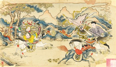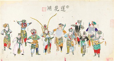 此外,還有一些作品屬于年畫畫師“點(diǎn)套”的粉本,即印出墨線版后,畫師直接在上面手工填色,刻工再據(jù)此分別刻出各塊色版。這類粉本過去在年畫作坊內(nèi)秘而不傳,今朝得見,也是非常難得。這次展覽中的《雅觀樓》《逍遙津》《雁門摘印》《捉放曹》《年年太平》等,就屬于粉本中的精品。