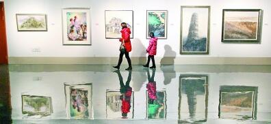 1月24日,山西省永濟市博物館歷史文化展展廳,攝影愛好者興致勃勃地欣賞當?shù)嘏e辦的“文博杯”文物攝影大賽作品展。