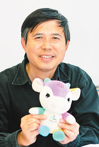 吳冠英和他設(shè)計(jì)的2008年北京殘奧會吉祥物“福?!?。 資料圖片
