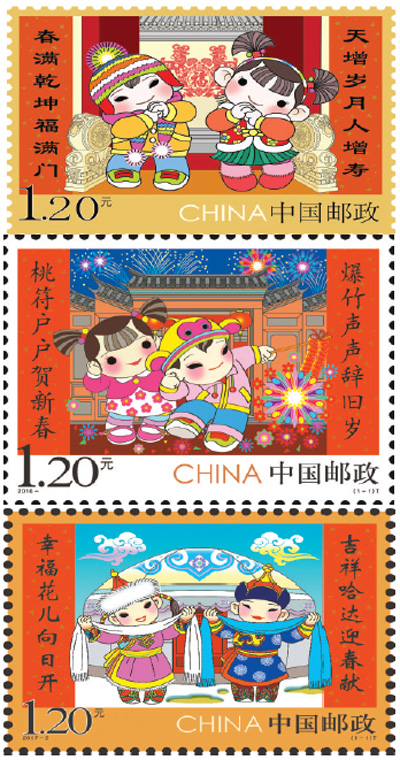 吳冠英設(shè)計(jì)的2015年、2016年、2017年《拜年》郵票。 資料圖片