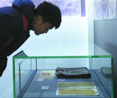 一名學(xué)生仔細(xì)觀看淞滬抗戰(zhàn)實(shí)物