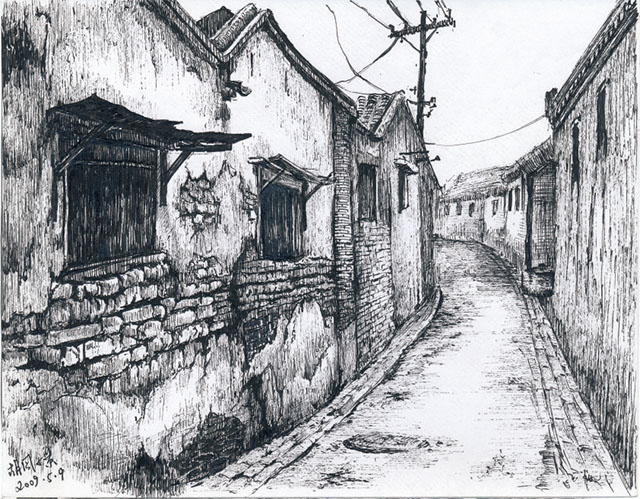 奚耀華說:“我畫胡同原本起于一種偶然,平時(shí)愛逛胡同,有胡同情節(jié),于是拍了不少舊胡同的照片,日常辦公閑暇之時(shí),便打開電腦,用辦公用的中性筆和便簽紙隨意描繪。漸漸地便有了一些感覺,對中性筆的筆性也逐漸掌握,于是一發(fā)而不可收拾。可以說沒有哪個(gè)畫家是專用中性筆作為繪畫工具的。我之所以一直沿用至今,一是因?yàn)樽约翰⒎菍I(yè),所用工具隨手拈來,信馬由韁;二是基于作品完成后的效果,與我理想的感覺很是接近,于是也不再想有所更換。中性筆兼有鋼筆的銳度和鉛筆的柔和,運(yùn)用得當(dāng),對于描繪舊胡同的滄桑感,有獨(dú)到的筆意?;蛟S,這也可以成為我繪畫創(chuàng)作的一個(gè)特點(diǎn)?!保ㄐ〕蹋?/p>