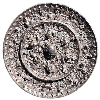 為什么要把海獸與葡萄組合在一起作為裝飾,到目前為止還沒有確切解釋。有的學(xué)者認(rèn)為它來源于古代的波斯或希臘羅馬。葡萄,又叫蒲桃,自漢代張騫出使西域帶回中原后,開始廣泛種植,到唐代時,葡萄的種植已非常流行,葡萄紋也頻繁用于絲綢裝飾。瑞獸紋在銅鏡裝飾上流行已久,在六朝、隋、唐初的銅鏡上極為盛行。由于唐代對外交流廣泛,受中西文化的影響,藝術(shù)家、工匠們極易在制鏡時把中西藝術(shù)巧妙結(jié)合,形成具有民族風(fēng)格的紋樣。這兩種紋樣在大唐寬松多元的文化氛圍下交融為一體,成為中國銅鏡裝飾紋樣由瑞獸紋向花鳥植物紋轉(zhuǎn)變的特殊產(chǎn)物,在銅鏡史上占有不可取代的重要地位。