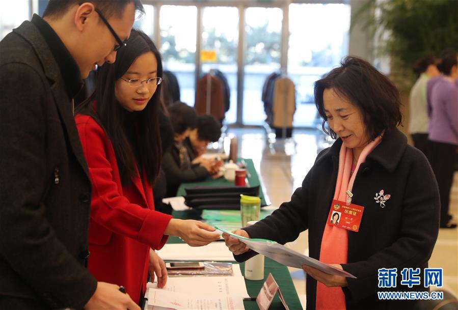 3月1日,全國政協(xié)委員姚一萍(右)抵達駐地北京會議中心。 當日,參加全國政協(xié)十二屆五次會議的委員陸續(xù)抵達駐地報到。 新華社記者邢廣利攝