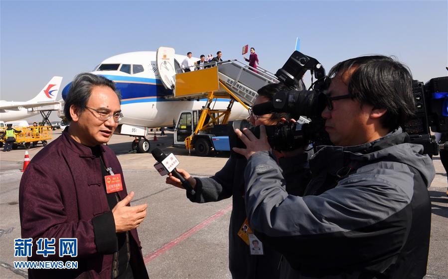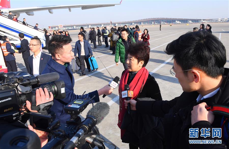 3月2日,出席十二屆全國人大五次會議的四川代表團乘坐飛機抵達北京。這是全國人大代表包惠(前右二)接受記者采訪。 新華社記者趙穎全攝