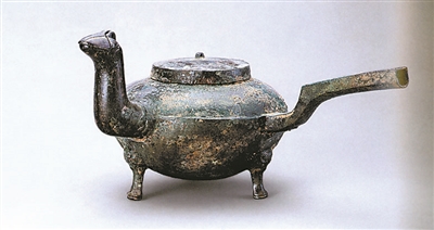 1963年陶然亭豁口外出土的雞首流鐎斗,通長14.2厘米。平蓋略鼓,蓋中央置一半環(huán)鈕,小口直沿,鼓腹,腹部置一雞首形曲頸流,首端可開合,與流呈90度角處有曲鋬,圜底,三蹄足。腹部飾一周弦紋,足根部飾以獸面紋。造型簡樸,為日常生活用品。