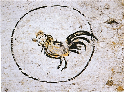 墓室西側(cè)的雞,與十二生肖中的“酉”位相對。身體輪廓的顏色為黑彩,內(nèi)填黃彩,高約25厘米。寥寥數(shù)筆,但很傳神。它雙腳直立,頭前傾,尾翼展開。雄赳赳,氣昂昂,斗志昂揚,似乎拉開架勢準(zhǔn)備大干一場。實際上,古人很早就注意到公雞的好斗習(xí)性?!稇?zhàn)國策》中記載,齊國都城臨淄其民無不吹竽、鼓瑟、擊筑、彈琴、斗雞、走犬。斗雞,至少在兩千多年前就已經(jīng)成為人們的一種娛樂方式。