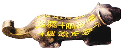 這枚 “戰(zhàn)國·秦·杜虎符”鑄于秦惠文君稱王前,秦國只有惠文君一人稱君,所以,杜虎符應(yīng)是惠文君在位時(shí)制作的。而銘文中提到的“杜”地,為戰(zhàn)國時(shí)秦國杜縣,故址在今西安市南?!皯?zhàn)國·秦·杜虎符”上的銘文是所有出土虎符中銘文最長的,且保存完好。特別是40個(gè)錯(cuò)金字,是在虎身鏤刻陰文,再將金絲嵌入陰文之內(nèi),最后鏤平打磨光亮,雖歷經(jīng)兩千多年,仍熠熠閃光。字體絕大部分是小篆,規(guī)整挺秀,反映了中國古代錯(cuò)金工藝的高超水平。