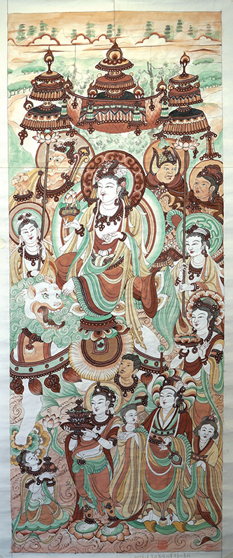 我已是耄耋之年的老人。逢老驥伏櫪、隨遇而安時(shí),現(xiàn)在有了這樣的際遇,把我半個(gè)多世紀(jì)以來,順應(yīng)敦煌藝術(shù)的脈絡(luò)發(fā)展、創(chuàng)新、應(yīng)用的(部分成果),以“花開敦煌”的含義和多樣的形式展示出來,(這是)我對(duì)敦煌藝術(shù)承前啟后發(fā)展應(yīng)用的感悟和衍生。