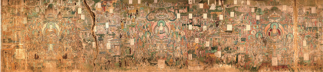 這鋪壁畫依托區(qū)區(qū)幾十平方米的墻壁上,卻將《大方便佛報恩經(jīng)》《彌勒菩薩上生經(jīng)》《大方廣佛華嚴經(jīng)》這三部經(jīng)卷極富創(chuàng)造性地架構(gòu)成為一個完整清晰的關(guān)聯(lián)系統(tǒng),把經(jīng)變故事和世俗的社會生態(tài)完美結(jié)合起來,堪稱人類文明和社會進步史上的經(jīng)典之作。